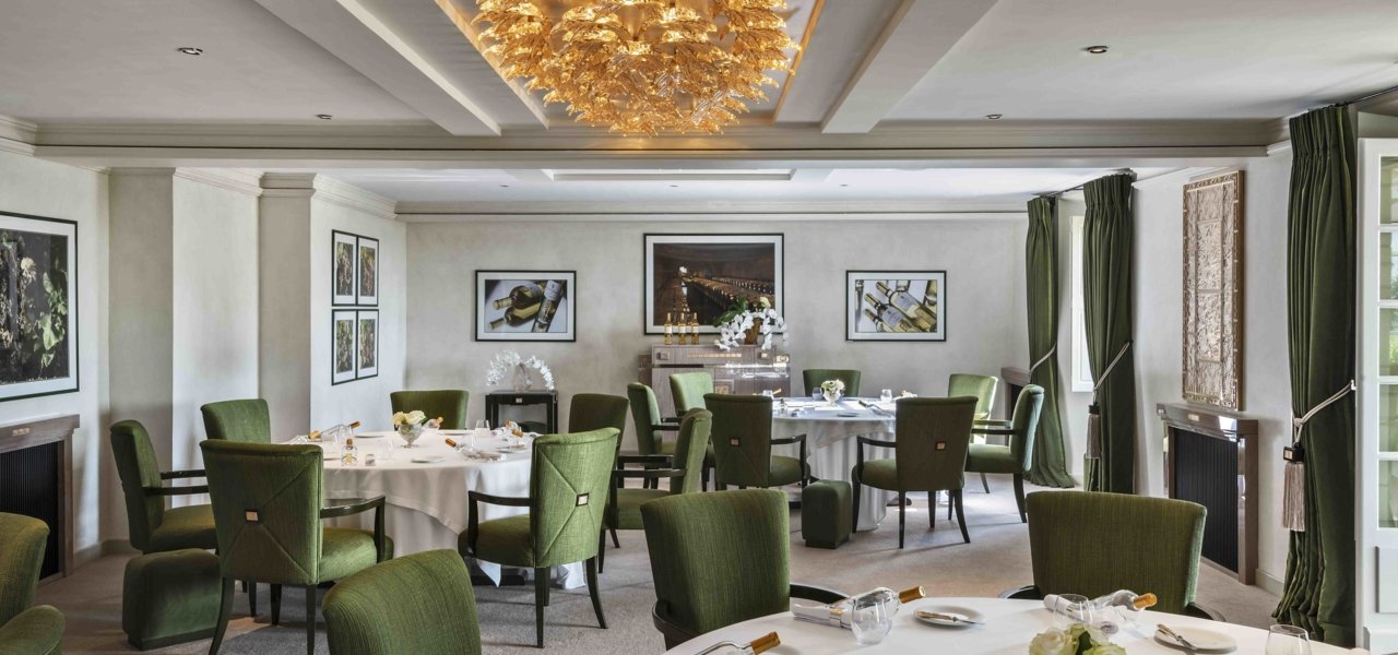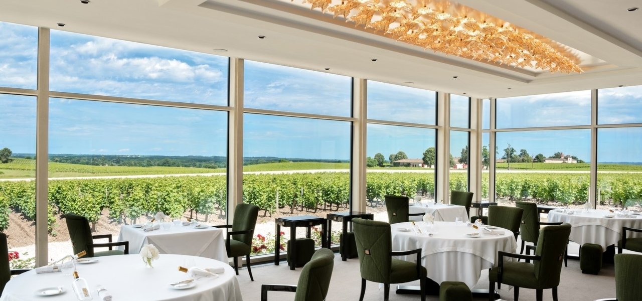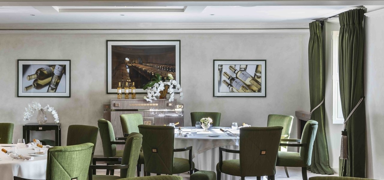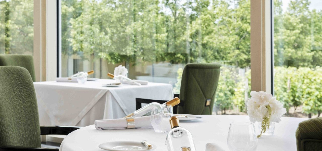 In the main 17th-century building, you find an initial subdued and cozy room followed by a second modern extension designed, fitting perfectly within the peaceful vine landscape. A total of 130 m2 in size with a capacity of 40 covers, the restaurant’s splendor unfolds: the ceiling is decorated with a hundred and twenty Semillon leaves in gleaming gold crystal, and other iconic Lalique pieces stand on console tables. Benefitting greatly from Lalique’s refinement and expertise, the table decorations boast a thousand subtleties: a symphony of crystal and porcelain, tassels, and carefully chosen flowers.