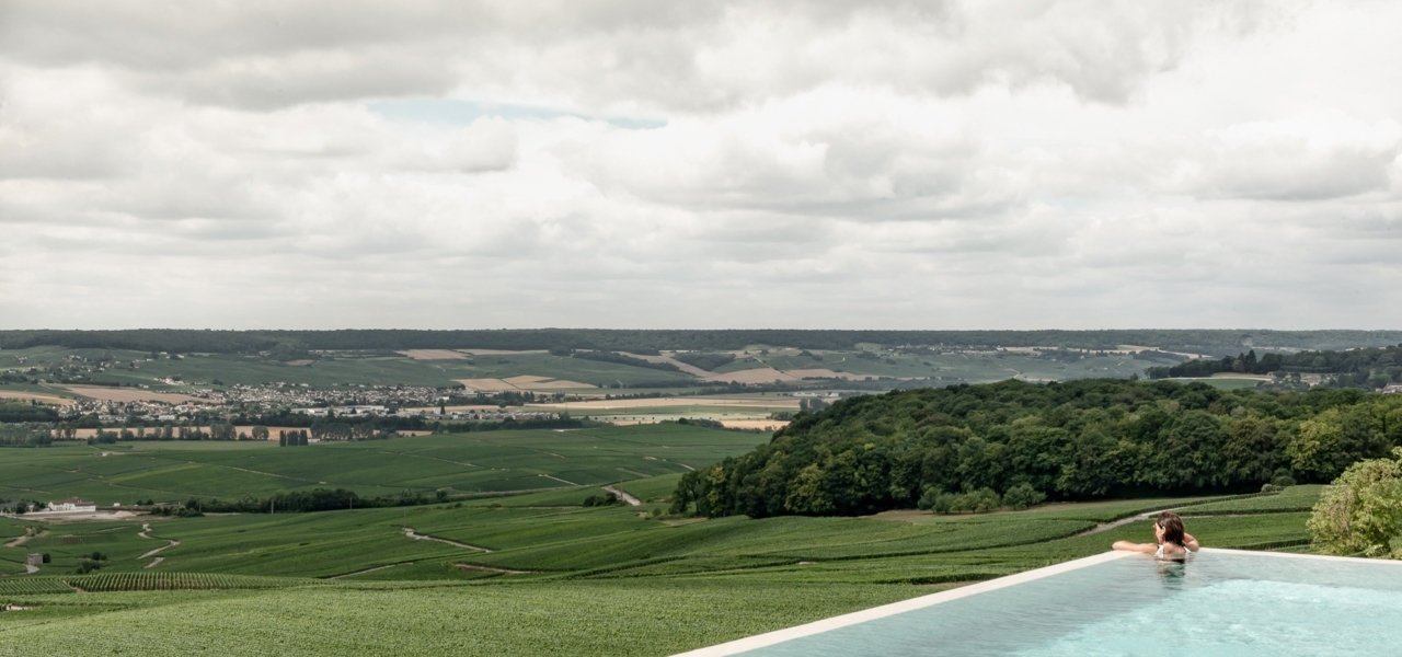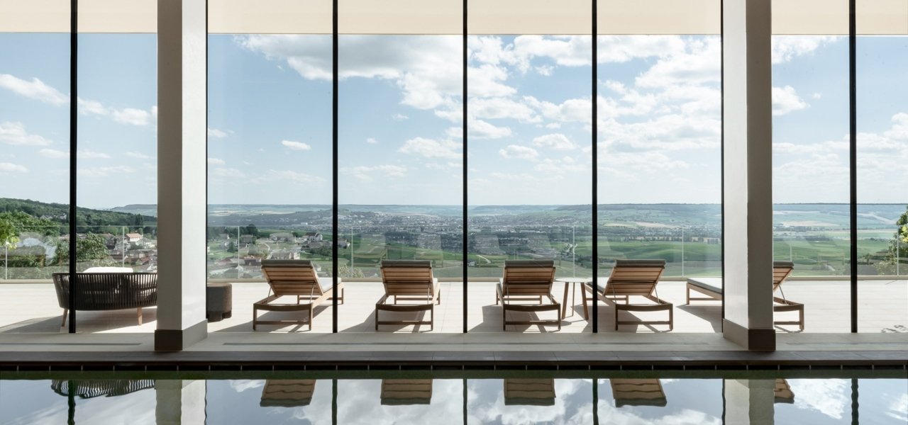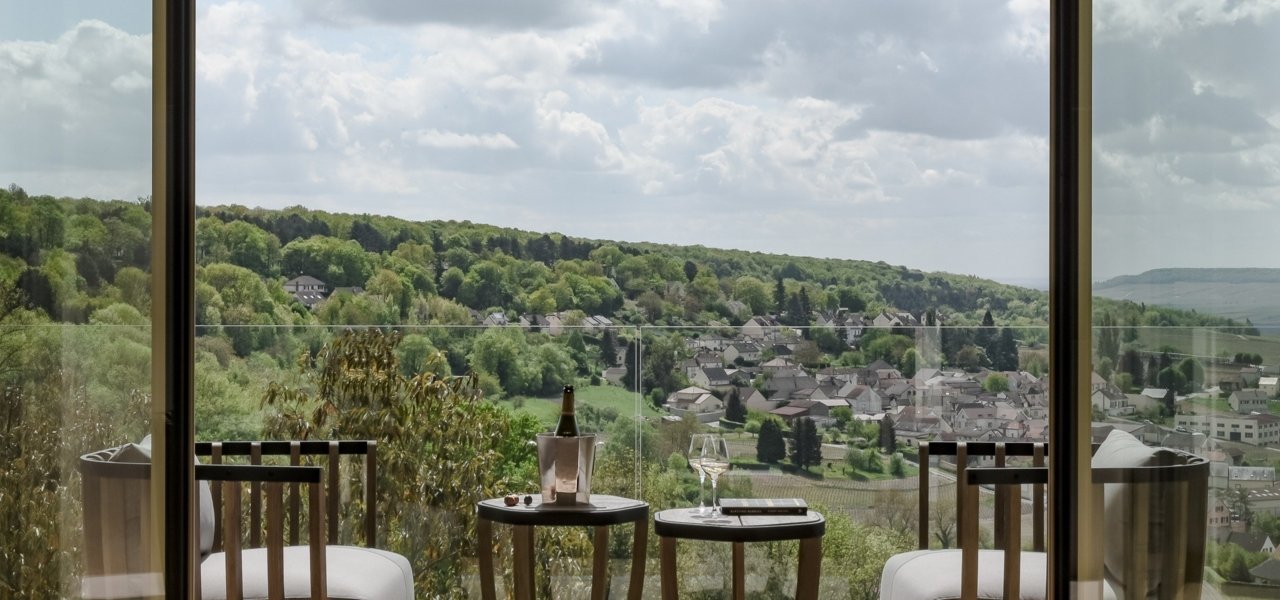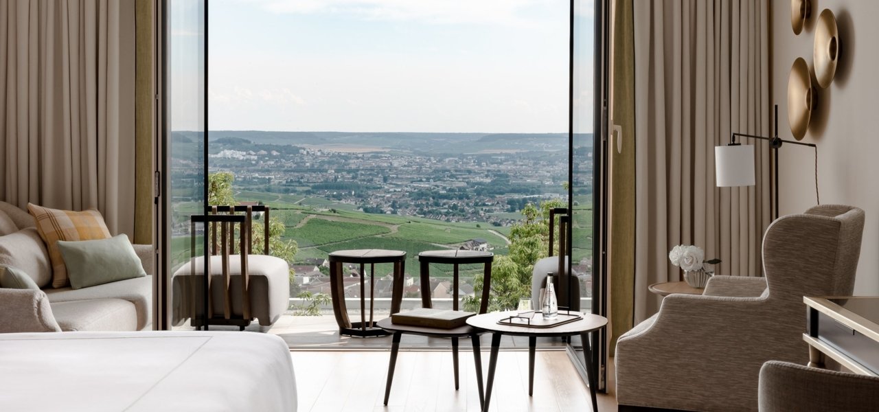 Located 90 minutes from Charles de Gaulle Airport and overlooking the vineyards that stripe the hills of Épernay and the villages of Champillon and Hautvillers, Royal Champagne Hotel & Spa is built like a contemporary amphitheater, offering stunning views from each of its 47 rooms and suites.