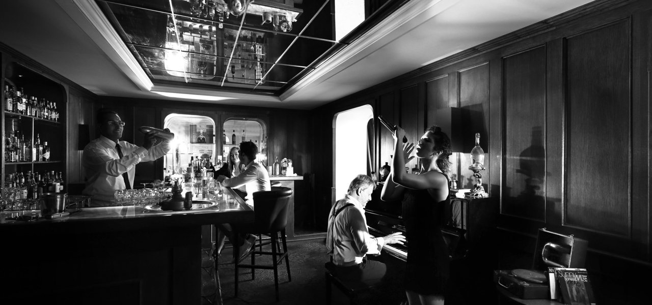 An inner bar in a cosy and elegant British club setting where one can listen to live music while sipping cocktails or liqueurs.