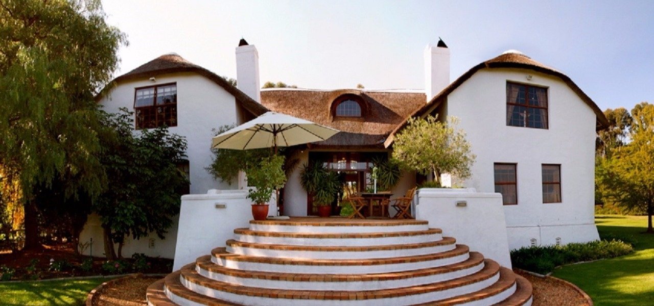 Beautiful typical South African Farm house of the Cape Dutch architecture with 5 bedrooms including a family apartment. The House is located 5 min walk from our cellar and tasting room and has a panoramic view swimming-pool, a game room, a chapel and 2 terraces. Available to book as a whole or as individual bedrooms.